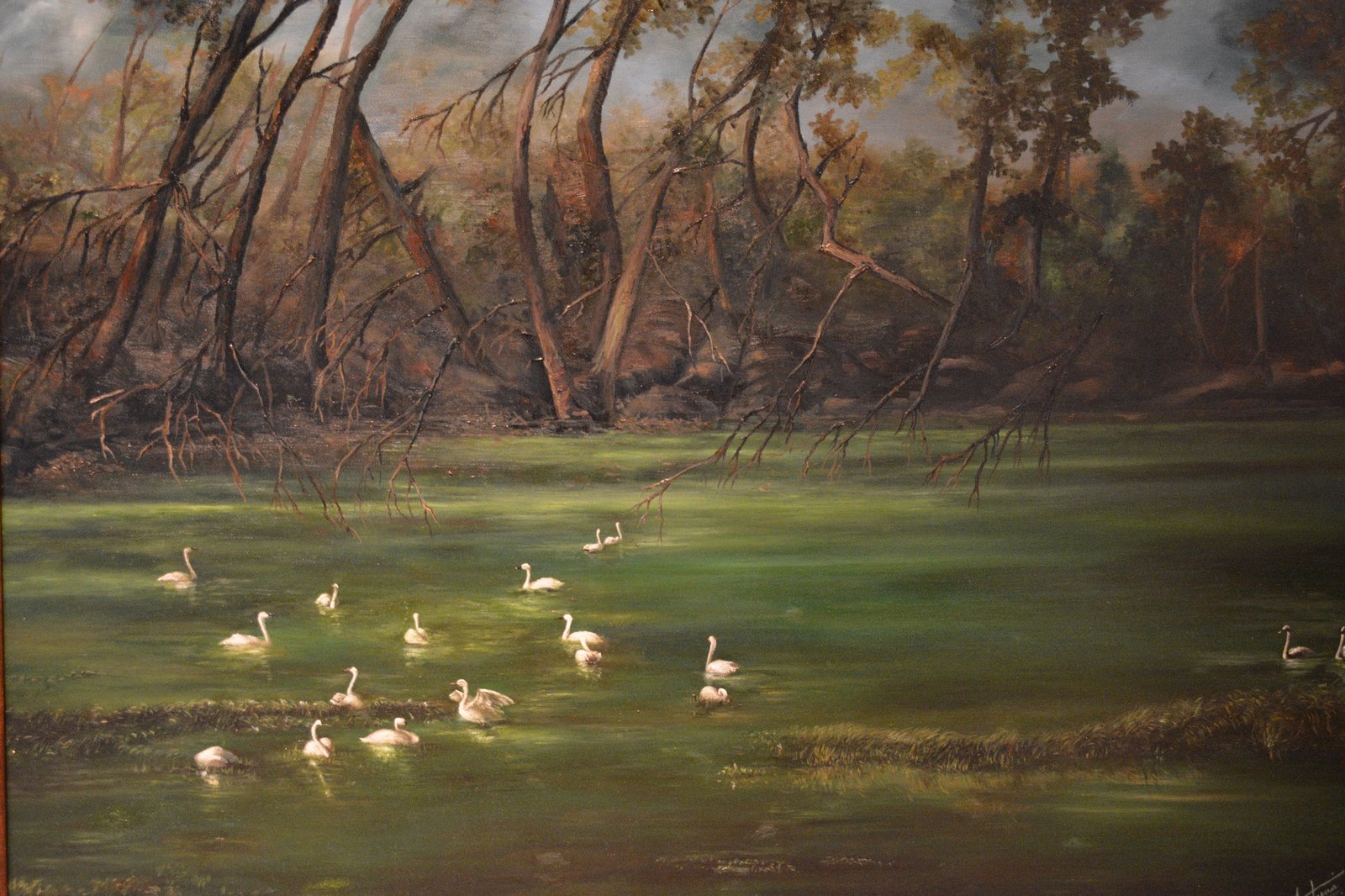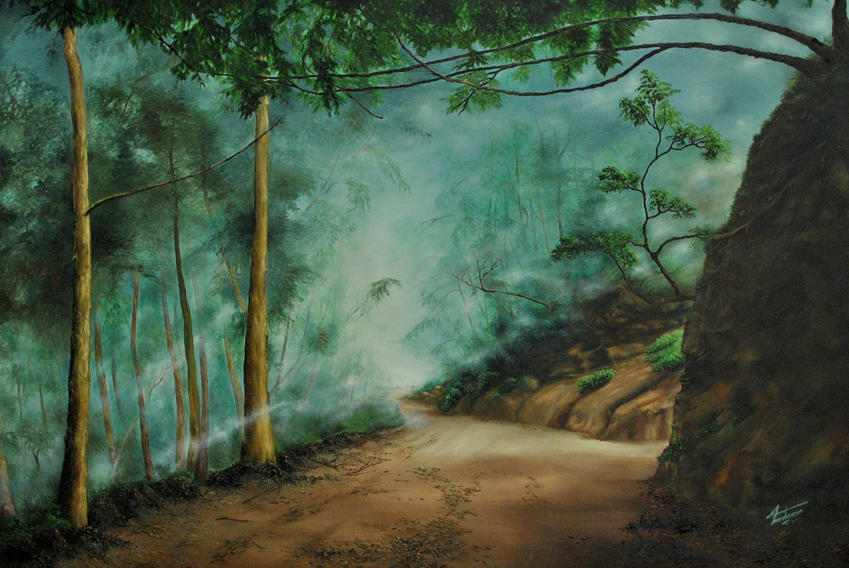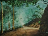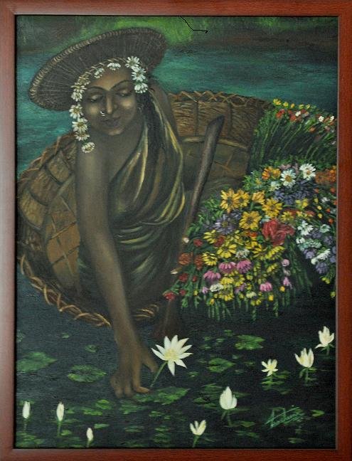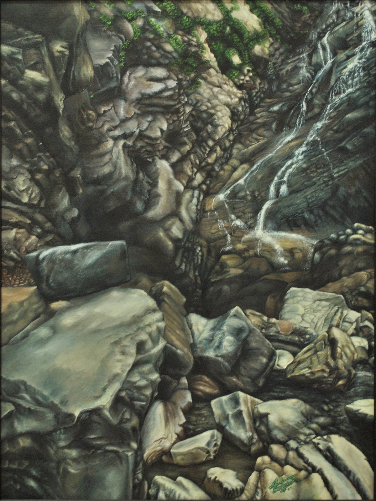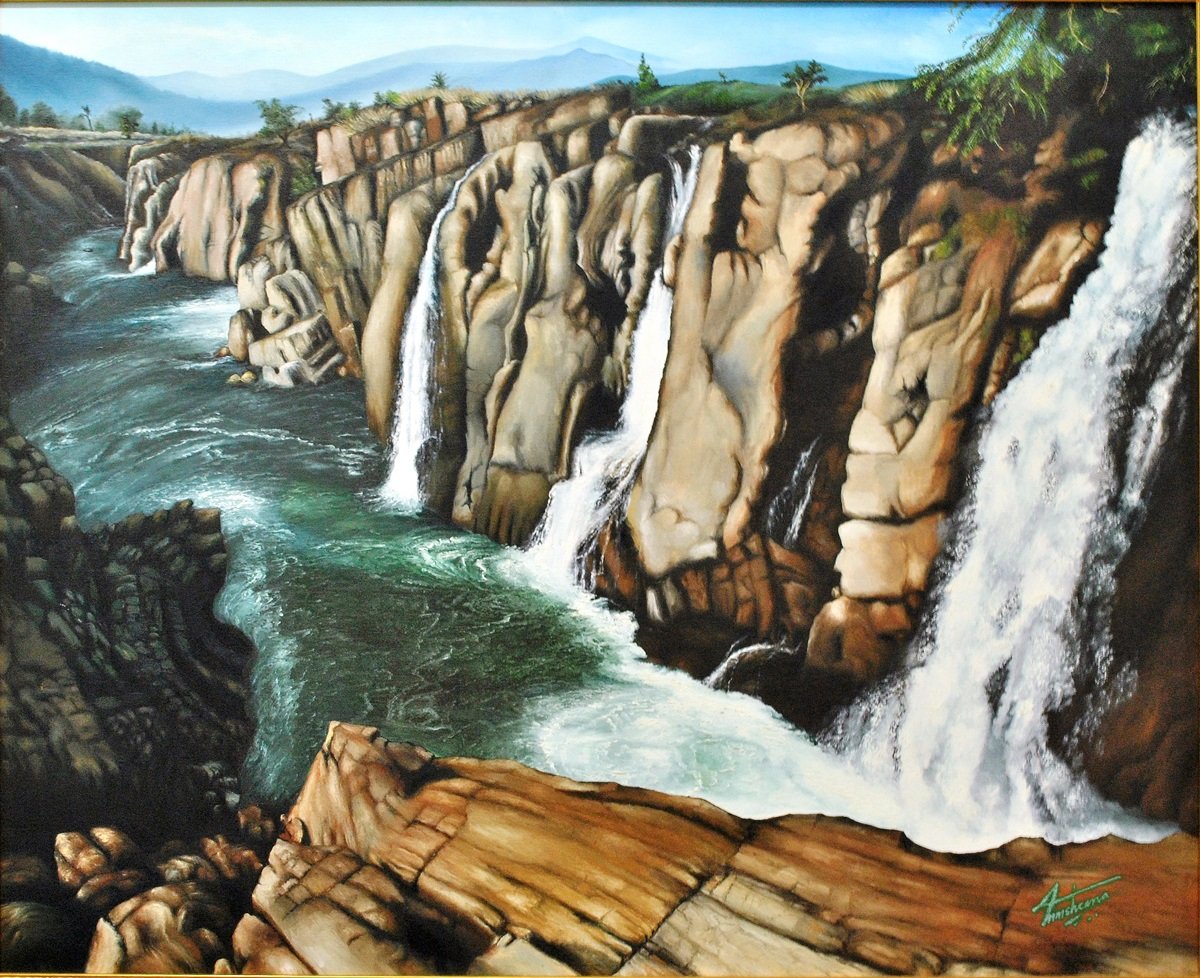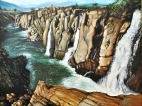 "Flow in Falls" (Warmth of Nature) (44"x 36") . Nothing captures the forceful resilience, natural wonder,and eye pleasing appeal of nature than the majestic waterfalls captured in this oil painting. It is a stunning real life depiction of the Hoganakal Wa
